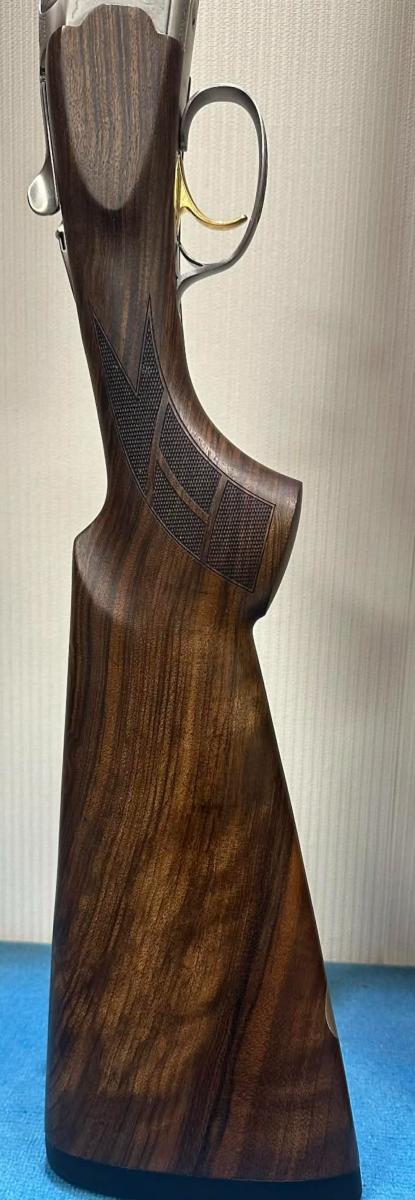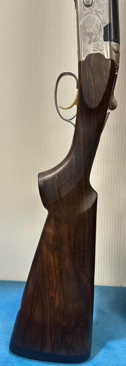 Vue de dessus, la finition particulière du fusil met en évidence la nouvelle gravure de la clé d’ouverture et le design élégant sur le haut de la bascule.